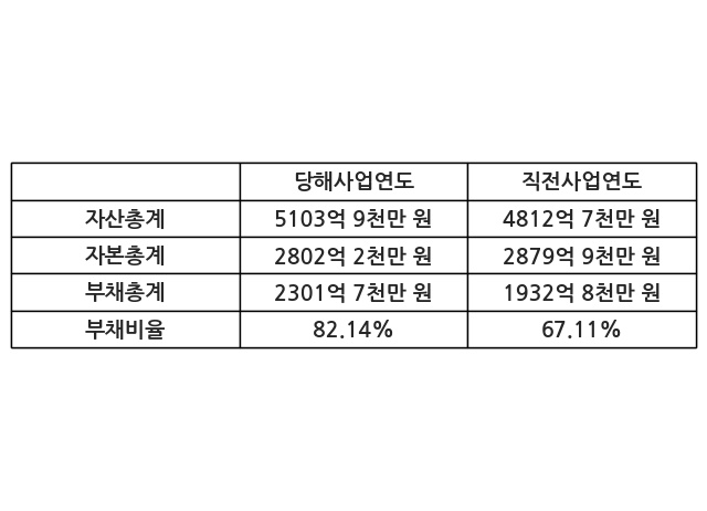 또한, 이번사업연도의 자산총계는 5103억 9천만 원으로 직전사업연도 대비 6.05% 증가한 한편, 부채총계는 2301억 7천만 원으로 19.09% 증가, 자본총계는 2802억 2천만 원으로 -2.7% 감소했다.