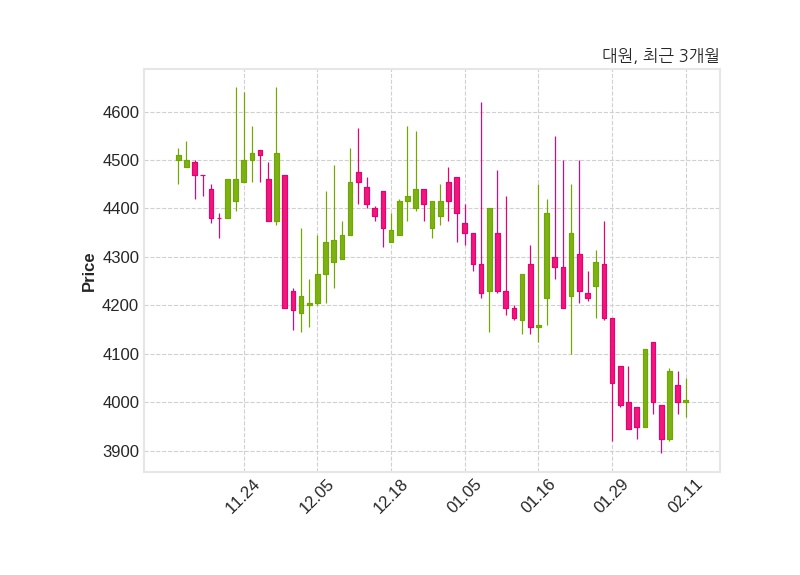 한편, 대원은 장 마감 이후 해당 기업공시를 발표했으며 오늘 종가가 4,005원, 거래량은 3,463주로, 직전 거래일 대비 5원(+0.12%) 상승했다.