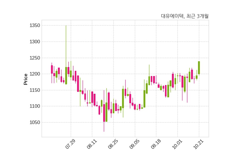 한편, 대유에이텍은 장 마감 이후 해당 기업공시를 발표했으며 오늘 종가가 1,239원, 거래량은 389,705주로, 직전 거래일 대비 44원(+3.68%) 상승했다.