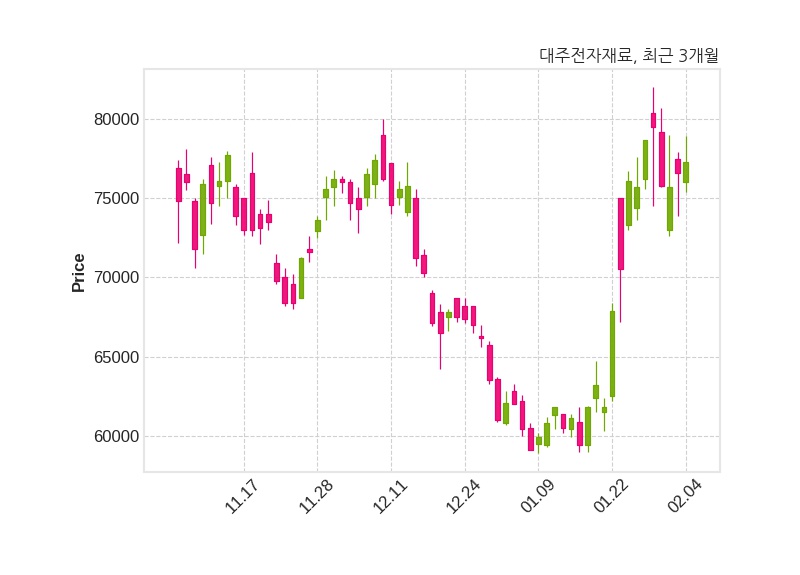 한편, 대주전자재료는 장 마감 이후 해당 기업공시를 발표했으며 오늘 종가가 77,300원, 거래량은 190,993주로, 직전 거래일 대비 700원(+0.91%) 상승했다.
