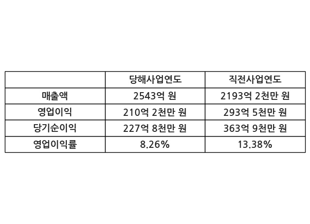 이번사업연도의 매출액은 직전사업연도 대비 15.95% 증가한 2543억 원, 영업이익은 210억 2천만 원, 당기순이익은 227억 8천만 원이라고 공시했다.