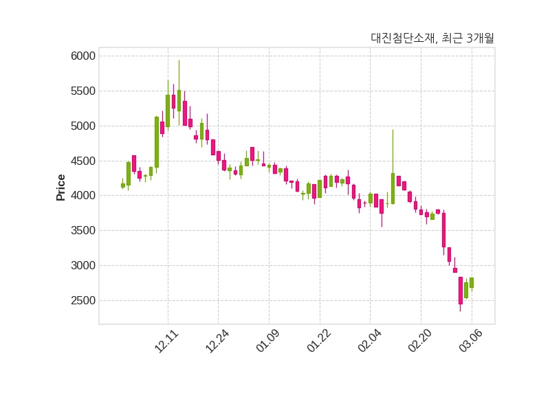 한편, 대진첨단소재는 장 마감 이후 해당 기업공시를 발표했으며 오늘 종가가 2,825원, 거래량은 297,182주로, 직전 거래일 대비 65원(+2.36%) 상승했다.