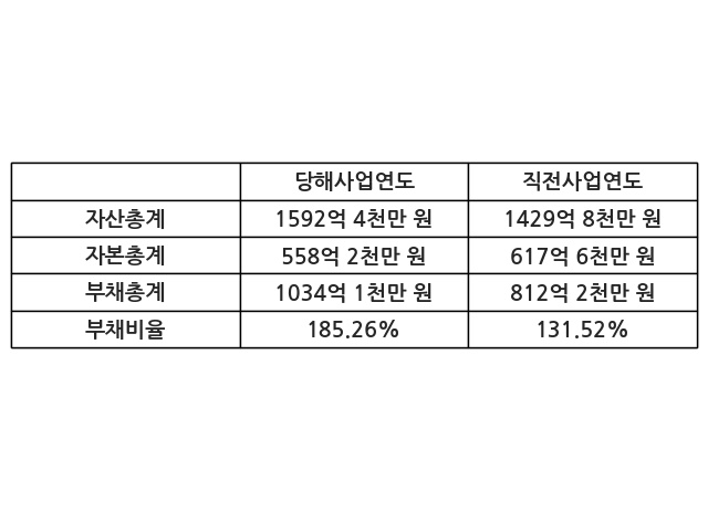 또한, 이번사업연도의 자산총계는 1592억 4천만 원으로 직전사업연도 대비 11.37% 증가한 한편, 부채총계는 1034억 1천만 원으로 27.32% 증가, 자본총계는 558억 2천만 원으로 -9.61% 감소했다.