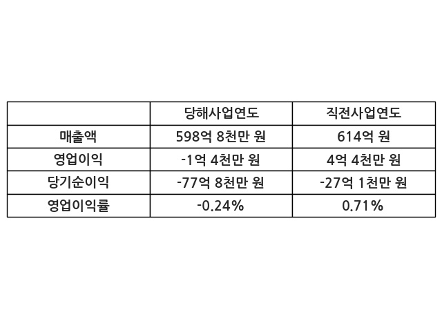 이번사업연도의 매출액은 직전사업연도 대비 -2.48% 감소한 598억 8천만 원, 영업이익은 -1억 4천만 원, 당기순이익은 -77억 8천만 원이라고 공시했다.