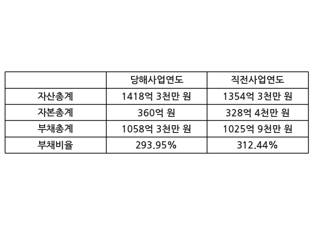 또한, 이번사업연도의 자산총계는 1418억 3천만 원으로 직전사업연도 대비 4.73% 증가한 한편, 부채총계는 1058억 3천만 원으로 3.16% 증가, 자본총계는 360억 원으로 9.64% 증가했다.