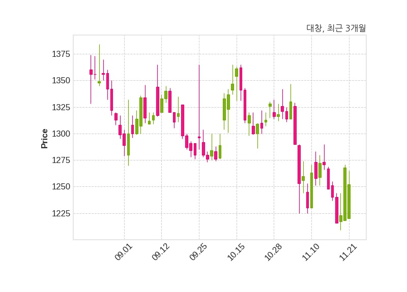 한편, 대창의 15시 15분 현재주가는 1,252원으로 직전 거래일 대비 16원(-1.26%) 하락이며, 거래량은 306,558주이다.