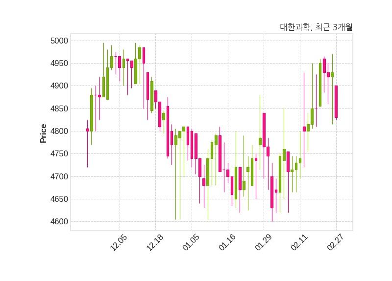 한편, 대한과학의 13시 54분 현재주가는 4,830원으로 직전 거래일 대비 100원(-2.03%) 하락이며, 거래량은 31,883주이다.