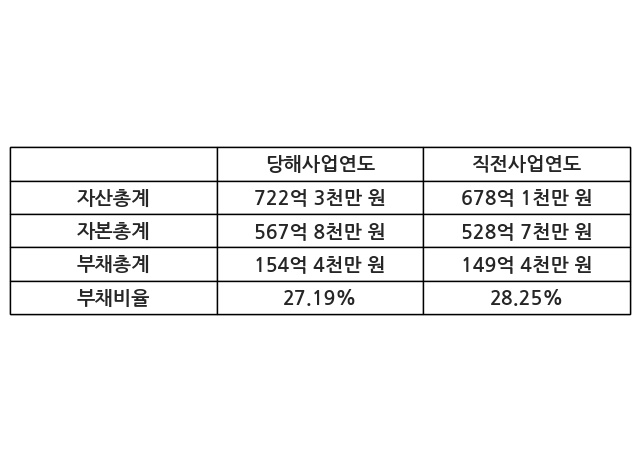 또한, 이번사업연도의 자산총계는 722억 3천만 원으로 직전사업연도 대비 6.51% 증가한 한편, 부채총계는 154억 4천만 원으로 3.37% 증가, 자본총계는 567억 8천만 원으로 7.39% 증가했다.
