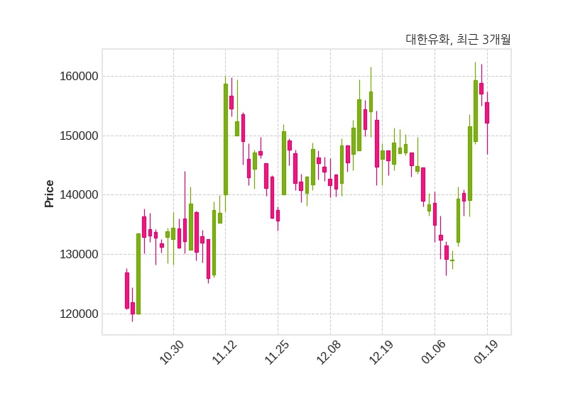 한편, 대한유화는 장 마감 이후 해당 기업공시를 발표했으며 오늘 종가가 152,100원, 거래량은 66,426주로, 직전 거래일 대비 4,900원(-3.12%) 하락했다.