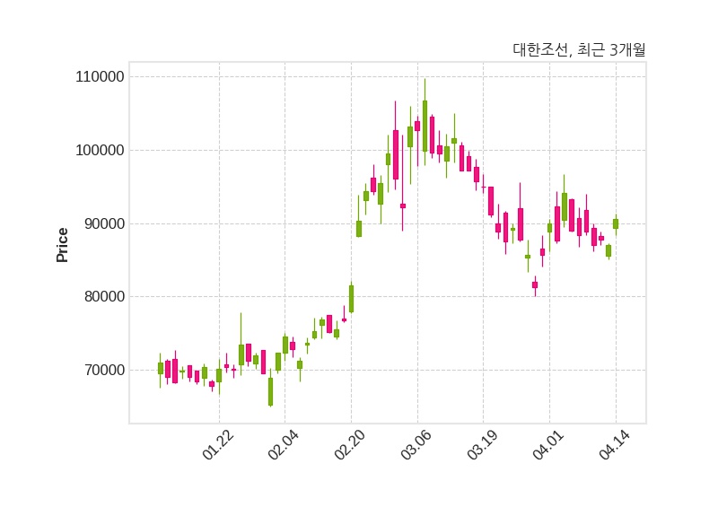 한편, 대한조선은 장 마감 이후 해당 기업공시를 발표했으며 오늘 종가가 90,600원, 거래량은 159,649주로, 직전 거래일 대비 3,600원(+4.14%) 상승했다.