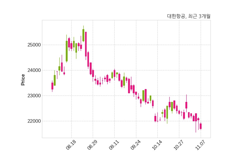 한편, 대한항공은 장 마감 이후 해당 기업공시를 발표했으며 오늘 종가가 21,700원, 거래량은 986,507주로, 직전 거래일 대비 350원(-1.59%) 하락했다.