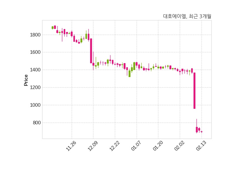 한편, 대호에이엘은 장 마감 이후 해당 기업공시를 발표했으며 오늘 종가가 696원, 거래량은 5,874,754주로, 직전 거래일 대비 18원(-2.52%) 하락했다.