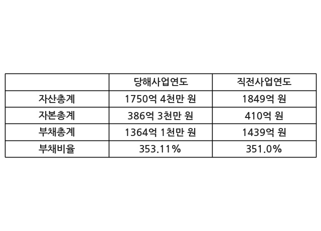 또한, 이번사업연도의 자산총계는 1750억 4천만 원으로 직전사업연도 대비 -5.34% 감소한 한편, 부채총계는 1364억 1천만 원으로 -5.21% 감소, 자본총계는 386억 3천만 원으로 -5.78% 감소했다.