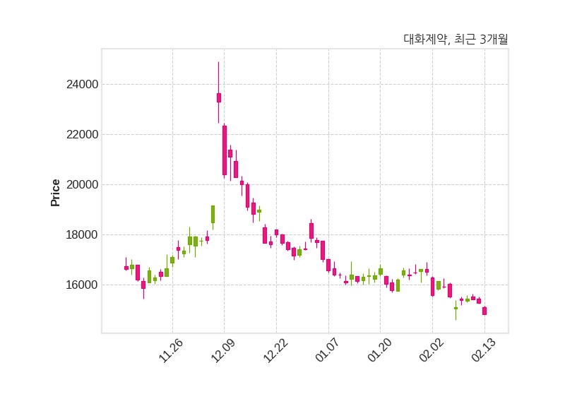 한편, 대화제약은 장 마감 이후 해당 기업공시를 발표했으며 오늘 종가가 14,840원, 거래량은 84,689주로, 직전 거래일 대비 430원(-2.82%) 하락했다.