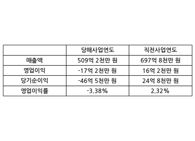 이번사업연도의 매출액은 직전사업연도 대비 -27.03% 감소한 509억 2천만 원, 영업이익은 -17억 2천만 원, 당기순이익은 -46억 5천만 원이라고 공시했다.