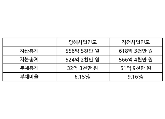 또한, 이번사업연도의 자산총계는 556억 5천만 원으로 직전사업연도 대비 -9.99% 감소한 한편, 부채총계는 32억 3천만 원으로 -37.81% 감소, 자본총계는 524억 2천만 원으로 -7.44% 감소했다.