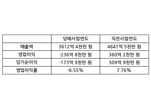이번사업연도의 매출액은 직전사업연도 대비 -22.17% 감소한 3612억 4천만 원, 영업이익은 -236억 8천만 원, 당기순이익은 -173억 9천만 원이라고 공시했다.