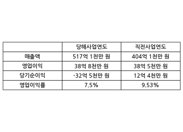 이번사업연도의 매출액은 직전사업연도 대비 27.95% 증가한 517억 1천만 원, 영업이익은 38억 8천만 원, 당기순이익은 -32억 5천만 원이라고 공시했다.