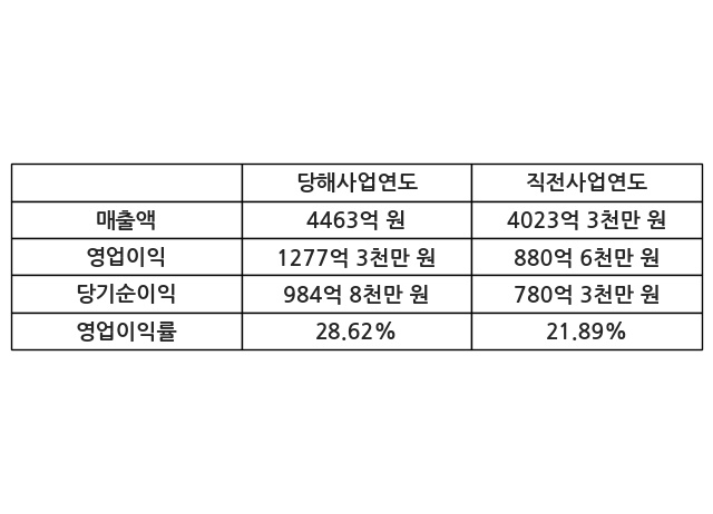 이번사업연도의 매출액은 직전사업연도 대비 10.93% 증가한 4463억 원, 영업이익은 1277억 3천만 원, 당기순이익은 984억 8천만 원이라고 공시했다.