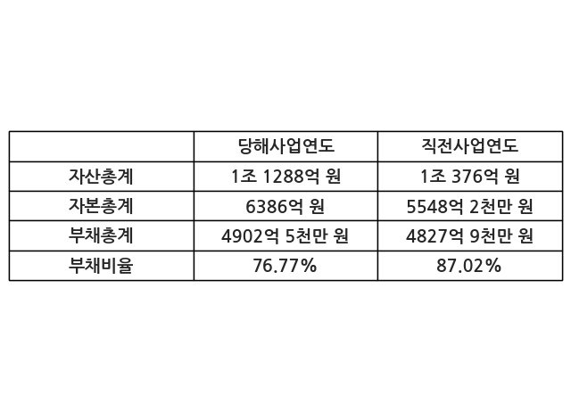 또한, 이번사업연도의 자산총계는 1조 1288억 원으로 직전사업연도 대비 8.79% 증가한 한편, 부채총계는 4902억 5천만 원으로 1.55% 증가, 자본총계는 6386억 원으로 15.1% 증가했다.
