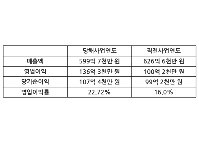 이번사업연도의 매출액은 직전사업연도 대비 -4.29% 감소한 599억 7천만 원, 영업이익은 136억 3천만 원, 당기순이익은 107억 4천만 원이라고 공시했다.