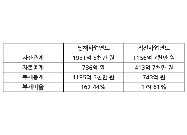 또한, 이번사업연도의 자산총계는 1931억 5천만 원으로 직전사업연도 대비 66.98% 증가한 한편, 부채총계는 1195억 5천만 원으로 60.9% 증가, 자본총계는 736억 원으로 77.91% 증가했다.