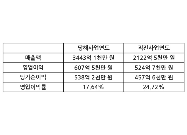 이번사업연도의 매출액은 직전사업연도 대비 62.22% 증가한 3443억 1천만 원, 영업이익은 607억 5천만 원, 당기순이익은 538억 2천만 원이라고 공시했다.