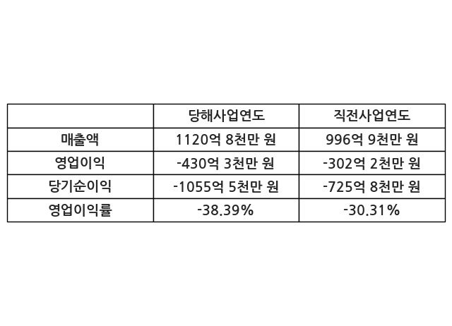 이번사업연도의 매출액은 직전사업연도 대비 12.42% 증가한 1120억 8천만 원, 영업이익은 -430억 3천만 원, 당기순이익은 -1055억 5천만 원이라고 공시했다.