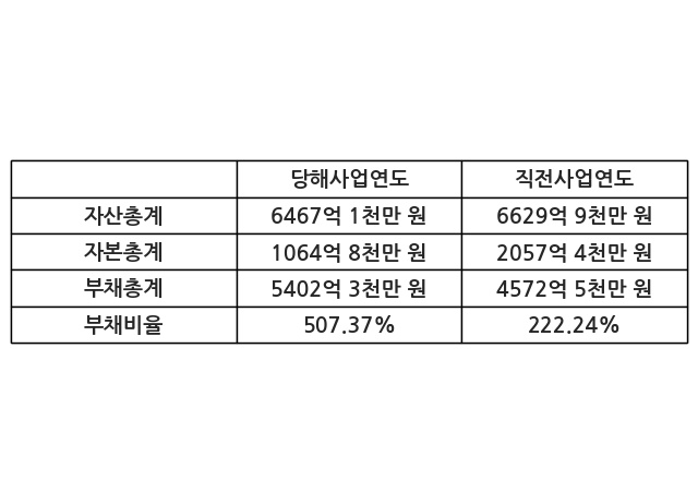 또한, 이번사업연도의 자산총계는 6467억 1천만 원으로 직전사업연도 대비 -2.46% 감소한 한편, 부채총계는 5402억 3천만 원으로 18.15% 증가, 자본총계는 1064억 8천만 원으로 -48.25% 감소했다.