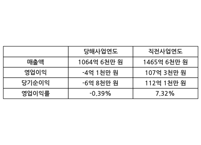 이번사업연도의 매출액은 직전사업연도 대비 -27.36% 감소한 1064억 6천만 원, 영업이익은 -4억 1천만 원, 당기순이익은 -6억 8천만 원이라고 공시했다.