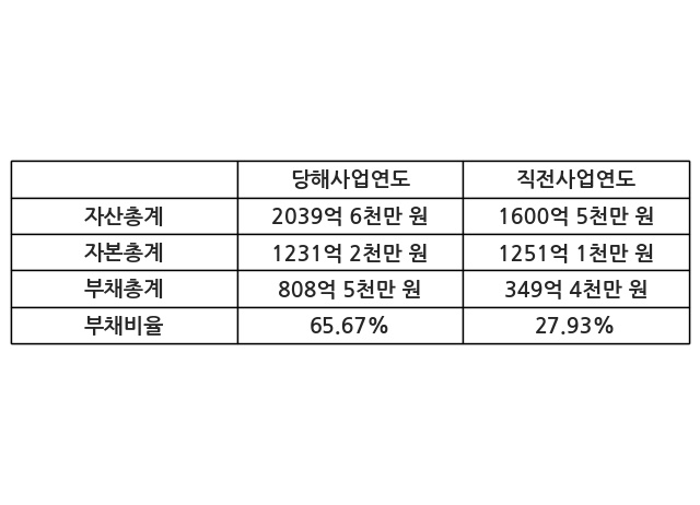 또한, 이번사업연도의 자산총계는 2039억 6천만 원으로 직전사업연도 대비 27.44% 증가한 한편, 부채총계는 808억 5천만 원으로 131.36% 증가, 자본총계는 1231억 2천만 원으로 -1.59% 감소했다.