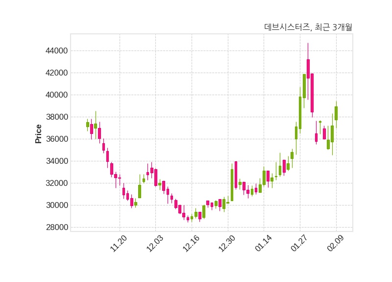 한편, 데브시스터즈의 11시 32분 현재주가는 38,950원으로 직전 거래일 대비 1,750원(+4.7%) 상승이며, 거래량은 63,757주이다.
