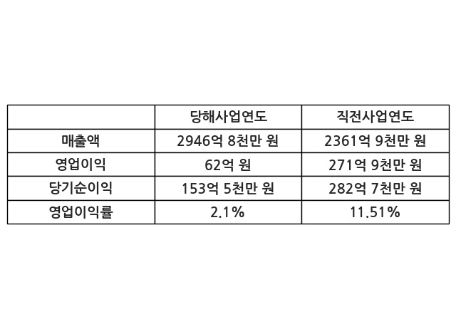 이번사업연도의 매출액은 직전사업연도 대비 24.77% 증가한 2946억 8천만 원, 영업이익은 62억 원, 당기순이익은 153억 5천만 원이라고 공시했다.