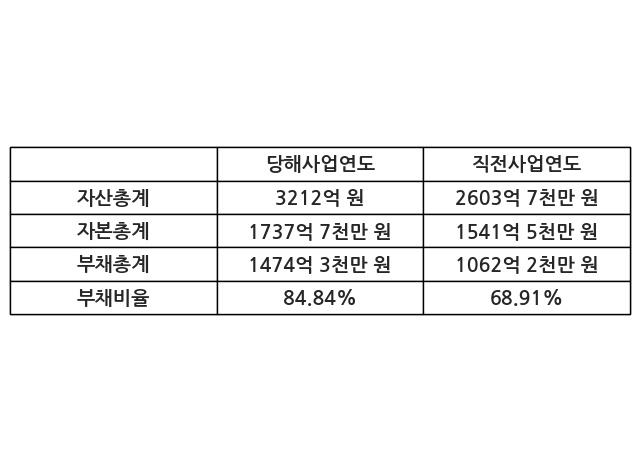 또한, 이번사업연도의 자산총계는 3212억 원으로 직전사업연도 대비 23.37% 증가한 한편, 부채총계는 1474억 3천만 원으로 38.8% 증가, 자본총계는 1737억 7천만 원으로 12.73% 증가했다.