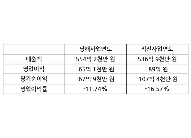 이번사업연도의 매출액은 직전사업연도 대비 3.22% 증가한 554억 2천만 원, 영업이익은 -65억 1천만 원, 당기순이익은 -67억 9천만 원이라고 공시했다.