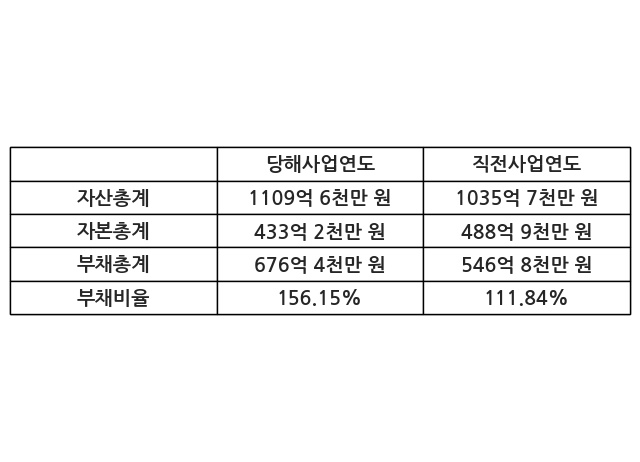 또한, 이번사업연도의 자산총계는 1109억 6천만 원으로 직전사업연도 대비 7.14% 증가한 한편, 부채총계는 676억 4천만 원으로 23.71% 증가, 자본총계는 433억 2천만 원으로 -11.4% 감소했다.