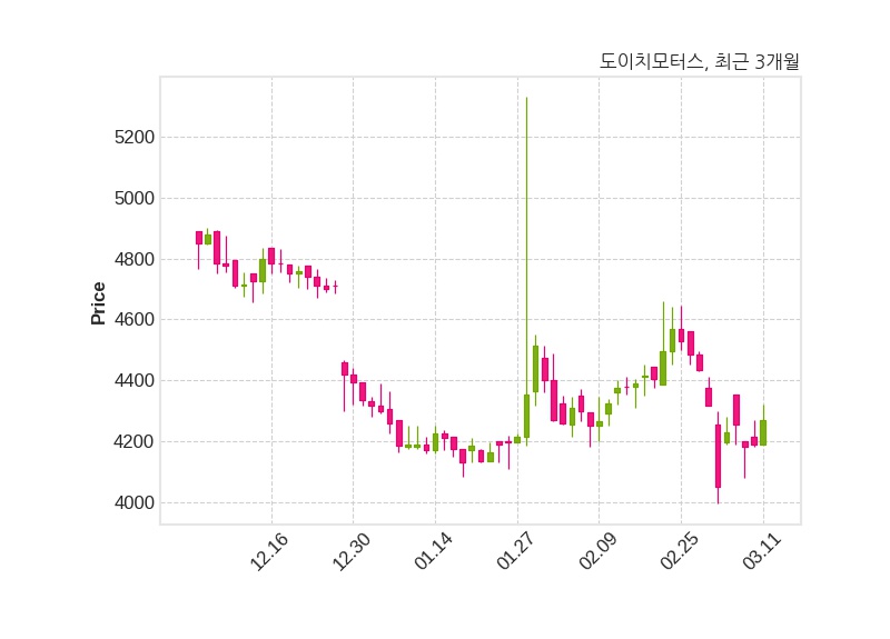 한편, 도이치모터스는 장 마감 이후 해당 기업공시를 발표했으며 오늘 종가가 4,270원, 거래량은 63,575주로, 직전 거래일 대비 80원(+1.91%) 상승했다.