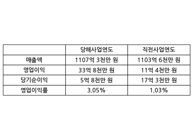 이번사업연도의 매출액은 직전사업연도 대비 0.34% 증가한 1107억 3천만 원, 영업이익은 33억 8천만 원, 당기순이익은 5억 8천만 원이라고 공시했다.