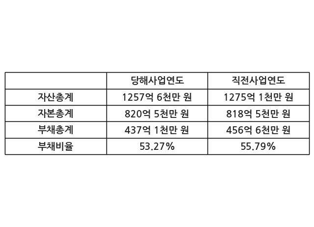 또한, 이번사업연도의 자산총계는 1257억 6천만 원으로 직전사업연도 대비 -1.37% 감소한 한편, 부채총계는 437억 1천만 원으로 -4.27% 감소, 자본총계는 820억 5천만 원으로 0.25% 증가했다.