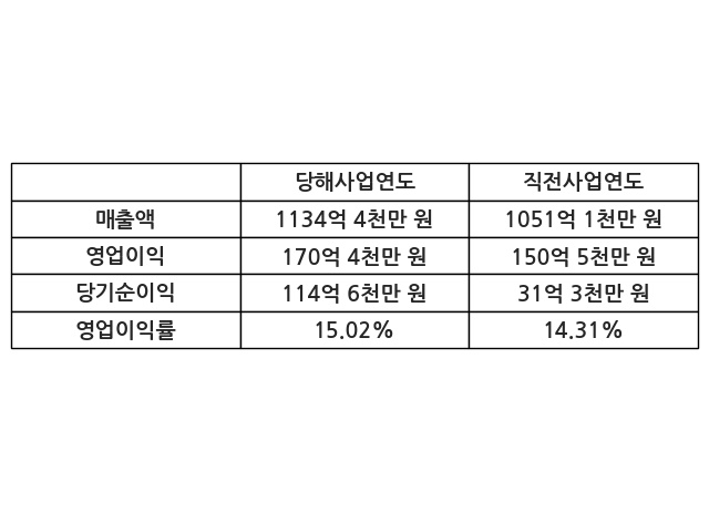 이번사업연도의 매출액은 직전사업연도 대비 7.92% 증가한 1134억 4천만 원, 영업이익은 170억 4천만 원, 당기순이익은 114억 6천만 원이라고 공시했다.