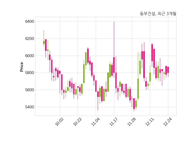 한편, 동부건설은 장 마감 이후 해당 기업공시를 발표했으며 오늘 종가가 5,800원, 거래량은 22,684주로, 직전 거래일 대비 20원(+0.35%) 상승했다.