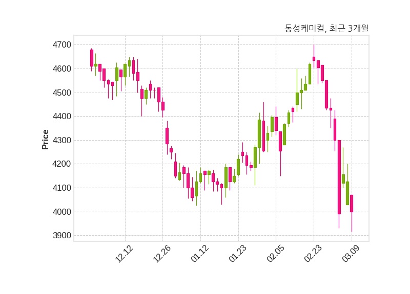 한편, 동성케미컬은 장 마감 이후 해당 기업공시를 발표했으며 오늘 종가가 4,000원, 거래량은 116,356주로, 직전 거래일 대비 125원(-3.03%) 하락했다.