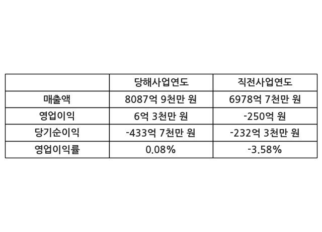 이번사업연도의 매출액은 직전사업연도 대비 15.89% 증가한 8087억 9천만 원, 영업이익은 6억 3천만 원, 당기순이익은 -433억 7천만 원이라고 공시했다.