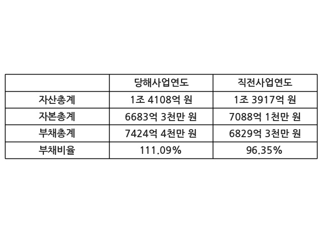 또한, 이번사업연도의 자산총계는 1조 4108억 원으로 직전사업연도 대비 1.37% 증가한 한편, 부채총계는 7424억 4천만 원으로 8.71% 증가, 자본총계는 6683억 3천만 원으로 -5.71% 감소했다.