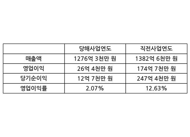 이번사업연도의 매출액은 직전사업연도 대비 -7.69% 감소한 1276억 3천만 원, 영업이익은 26억 4천만 원, 당기순이익은 12억 7천만 원이라고 공시했다.