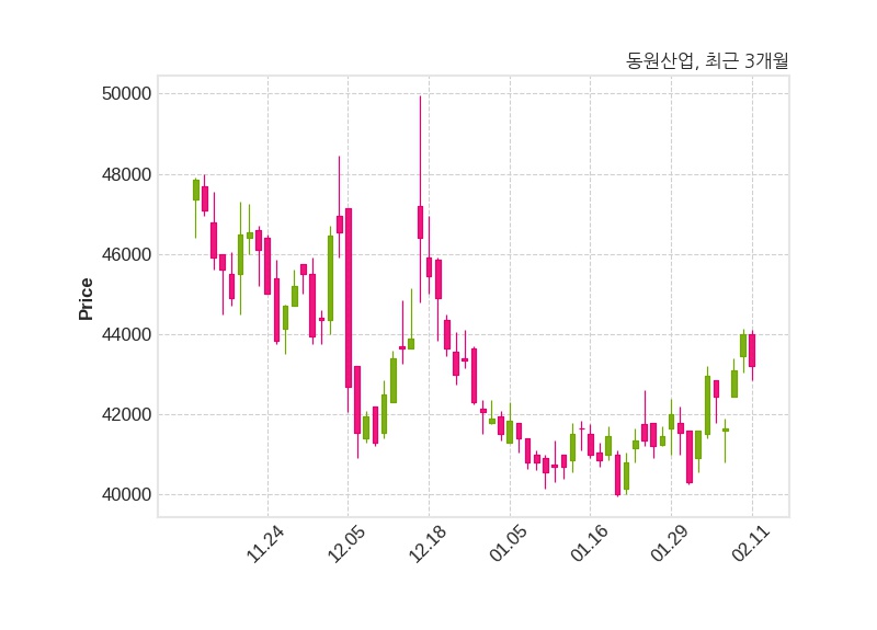 한편, 동원산업의 14시 28분 현재주가는 43,200원으로 직전 거래일 대비 800원(-1.82%) 하락이며, 거래량은 76,902주이다.