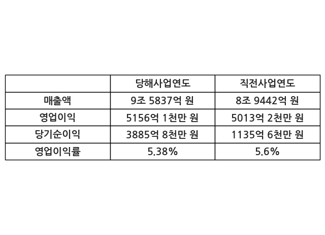 이번사업연도의 매출액은 직전사업연도 대비 7.15% 증가한 9조 5837억 원, 영업이익은 5156억 1천만 원, 당기순이익은 3885억 8천만 원이라고 공시했다.