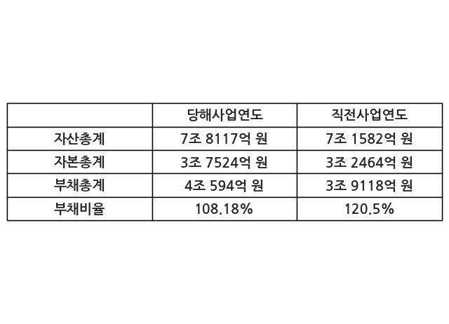 또한, 이번사업연도의 자산총계는 7조 8117억 원으로 직전사업연도 대비 9.13% 증가한 한편, 부채총계는 4조 594억 원으로 3.77% 증가, 자본총계는 3조 7524억 원으로 15.58% 증가했다.