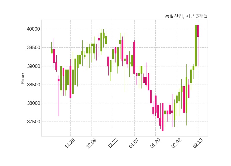 한편, 동일산업은 장 마감 이후 해당 기업공시를 발표했으며 오늘 종가가 39,800원, 거래량은 1,814주로, 직전 거래일 대비 300원(-0.75%) 하락했다.