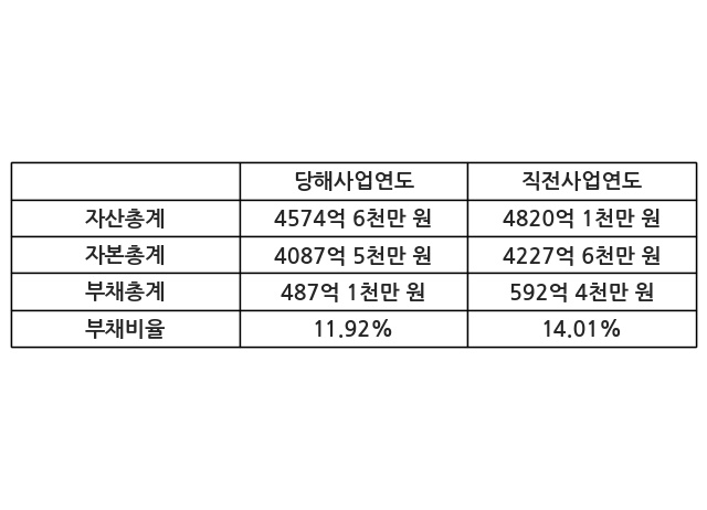 또한, 이번사업연도의 자산총계는 4574억 6천만 원으로 직전사업연도 대비 -5.09% 감소한 한편, 부채총계는 487억 1천만 원으로 -17.78% 감소, 자본총계는 4087억 5천만 원으로 -3.32% 감소했다.